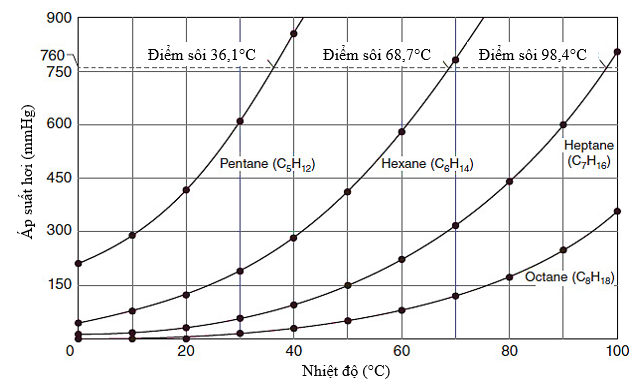 Hình 1 minh họa mối quan hệ giữa áp suất hơi và nhiệt độ đối với bốn hợp chất hữu cơ thuộc nhóm alkane. Điểm sôi thông thường được biểu thị bằng một đường nét đứt nằm ngang.