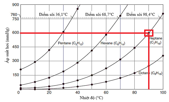 Theo Hình 1, tại nhiệt độ 90°C, áp suất hơi của heptane là ________.