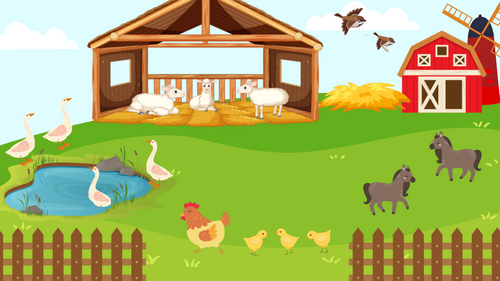Quan sát tranh ta thấy có các con vật: vịt, gà, cừu, ngựa, chim. Đếm số lượng từng loài