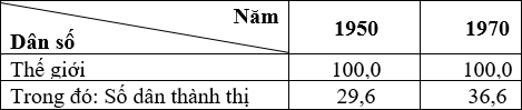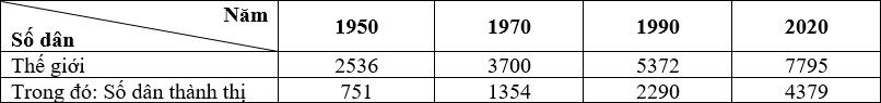 Cho bảng số liệu: Số dân và số dân thành thị của thế giới giai đoạn 1950-2020 (Đơn vị: