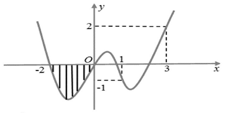 Cho hàm số \(y = f\left( x \right)\) có đạo hàm trên \(\mathbb{R}\), đồ thị hàm số \(y = f\left( x \right)\) như hình vẽ. Biết diện tích hình phẳng phần sọc kẻ bằng 3 . Tính giá trị của biểu thức: