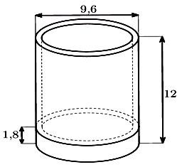 Cần bao nhiêu \({\rm{c}}{{\rm{m}}^3}\) thuỷ tinh để làm một chiếc cốc hình trụ có chiều cao bằng \(12{\rm{\;cm}}\), đường kính đáy bằng \(9,6{\rm{\;cm}}\) (tính từ mép ngoài cốc), đáy cốc dày \(1,8{\rm{\;cm}}\), thành xung quanh cốc dày \(0,24{\rm{\;cm}}\) ? (kết quả lấy gần đúng đến hai chữ số thập phân)