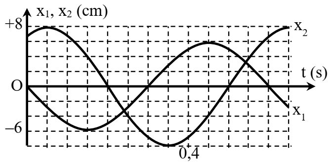 Dao động của một con lắc lò xo theo phương ngang là tổng hợp của hai dao động điều hòa cùng phương có đồ thị biểu diễn sự thay đổi li độ dao động theo thời gian như hình vẽ bên. Biết độ lớn của lực đàn hồi tác dụng lên vật nặng của con lắc vào thời điểm t = 0,4 s là \(0,4\sqrt 3 N.\) Lấy gia tốc trọng trường\(g = 10\left( {{\rm{m/}}{{\rm{s}}^{\rm{2}}}} \right).\) Lực đàn hồi cực đại của lò xo bằng