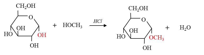 | c) Fructose tác dụng với CH3OH theo tỉ lệ mol 1 : 2 với xúc tác HCl khan. | ||