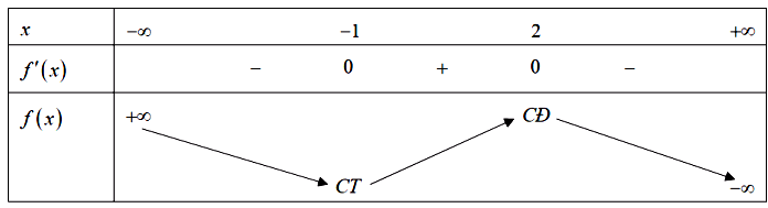 Cho hàm số \(y = f\left( x \right)\) có đạo hàm \(f'\left( x \right) = - \left( {x + 1} \right){(x - 2)^3},\forall x \in \mathbb{R}\). Số điểm cực trị của hàm số đã cho là