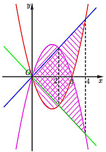 Cho \(\left( H \right)\) là hình phẳng được giới hạn bởi parabol \(y = {x^2} - 3x\) và đường thẳng \(y = x\) (tham khảo hình vẽ bên). Thể tích khối tròn xoay được tạo bởi khi quay \(\left( H \right)\) quanh trục hoành là \( \dfrac{{a\pi }}{b}\) với \(a,\,b\) là các số nguyên dương, \( \dfrac{a}{b}\) tối giản. Giá trị của \(18a - 300b\) bằng
