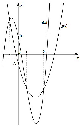 Cho hai hàm số \(f\left( x \right) = a{x^3} + b{x^2} + cx + {\rm{d}}\left( {a,b,c,d \in \mathbb{R}} \right)\) và \(g\left( x \right) = m{x^2} + nx + p\left( {m,n,p \in \mathbb{R}} \right)\). Biết hàm số \(y = f\left( x \right)\) và \(y = g\left( x \right)\) cắt nhau tại ba điểm phân biệt có hoành độ lần lượt là \( - 1,1\) và 3 ( như hình vẽ bên dưới). Gọi \(A,B\) lần lượt là hai giao điểm của hai đồ thị với trục tung và \(AB = 3\).