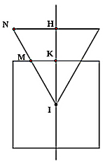 Người ta lồng ghép một hình vuông và một tam giác đều với nhau sao cho một đỉnh của tam giác đều trùng với tâm của hình vuông, trục của tam giác đều trùng với trục của hình vuông (như hình vẽ). Biết tam giác đều và hình vuông cùng có cạnh bằng \(6{\rm{\;cm}}\). Tính thể tích của vật thể tròn xoay sinh bởi hình đã cho khi quay quanh trục, làm tròn kết quả đến hàng phần nghìn.