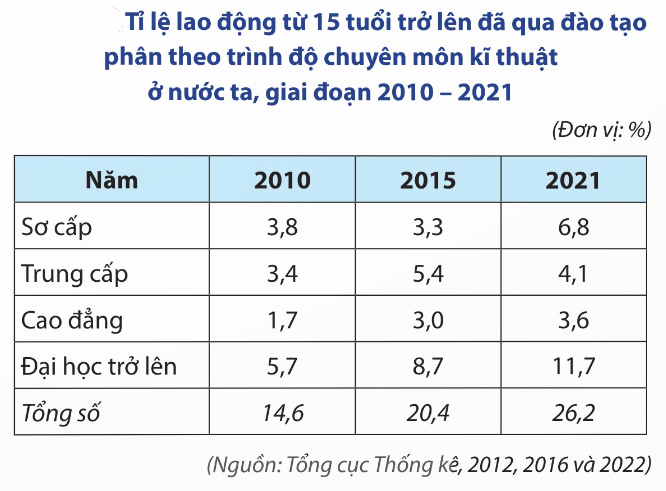 | b) Năm 2021, tỉ lệ lao động đã qua đào tạo nhóm đại học trở lên cao nhất sau đó là nhóm trung cấp, tiếp đến là nhóm sơ cấp và cuối cùng là cao đẳng. | ||