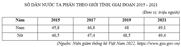 Theo bảng số liệu, để thể hiện sự thay đổi cơ cấu dân số phân theo giới tính của nước ta giai đoạn 2015 - 2021, dạng biểu đồ nào sau đây là thích hợp nhất?