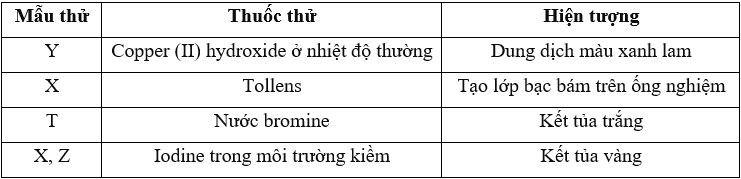 Tiến hành thí nghiệm với các dung dịch X, Y, Z và T. Kết quả được ghi ở bảng sau:X, Y, Z, T