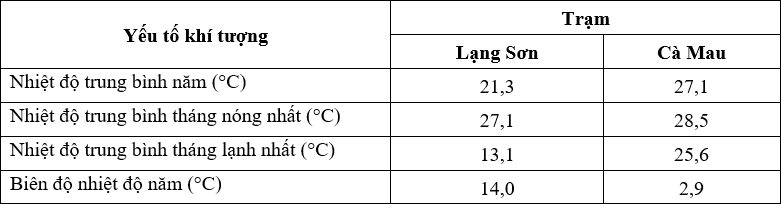 Từ bảng số liệu trên, hãy nhận xét sự khác nhau về chế độ nhiệt giữa Lạng Sơn và Cà Mau.