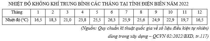 Căn cứ vào bảng số liệu trên, tính nhiệt độ không khí trung bình năm của tỉnh Điện Biên năm 2022 (làm tròn kết quả đến một chữ số của phần thập phân).