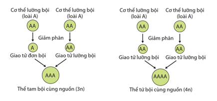| b) Sự kết hợp giao tử đực 2n và giao tử cái 2n cùng loài trong quá trình thụ tinh hình thành thể tứ bội. |