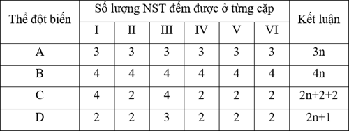 Bộ nhiễm sắc thể (NST) của một loài thực vật hạt kín có 6 cặp NST kí hiệu là I, II, III, IV, V, VI. Khảo sát một quần thể của loài này người ta phát hiện có 4 thể đột biến kí hiệu là A, B, C, D. Phân tích tế bào của bốn thể đột biến trên người ta thu được kết quả như sau: