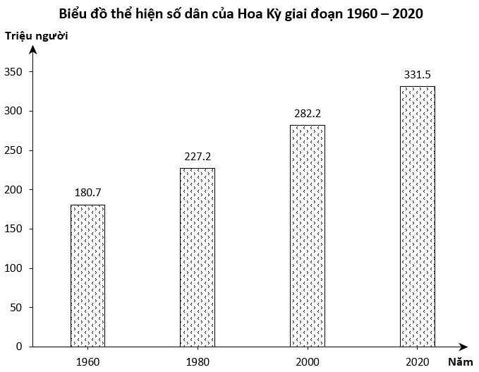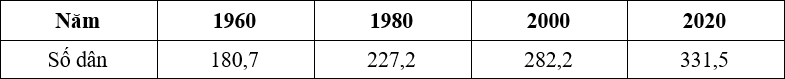 Cho bảng số liệu sau: Số dân của Hoa Kỳ giai đoạn 1960 – 2020 (Đơn vị: triệu người) Hãy