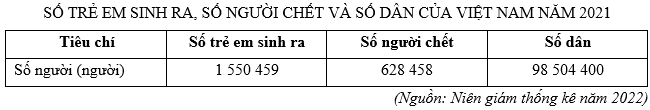 Căn cứ vào bảng số liệu trên, tính tỉ suất sinh thô (‰) của Việt Nam năm 2021 (làm tròn kết quả đến hàng đơn vị).