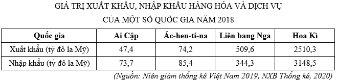 Cho bảng số liệu:Dựa vào bảng số liệu, hãy cho biết năm 2018 Liên bang Nga xuất siêu bao nhiêu