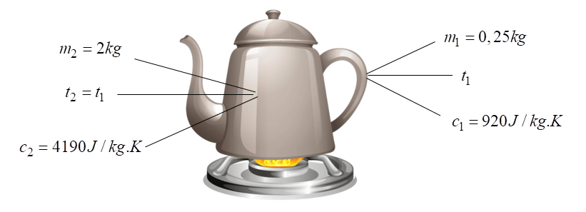 | c) Nhiệt lượng của ấm nước thu vào (nhiệt lượng cần cung cấp để ấm đạt đến \({80^0}C\)) là \(Q = {Q_1} + {Q_2}\) | ||