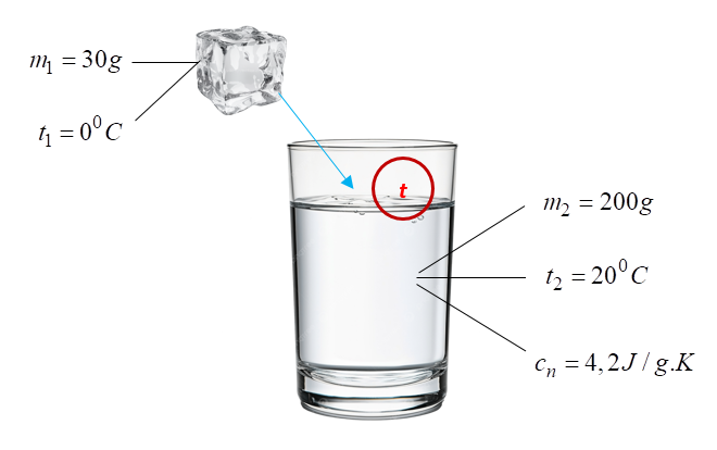 Thả một cục nước đá có khối lượng 30 gam ở \({0^0}C\) vào cốc nước có