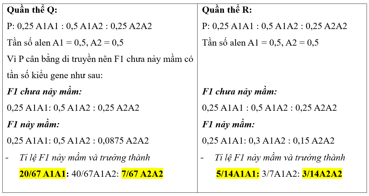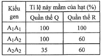 0,50 A1A2: 0,25 A2A2. Từ thế hệ F1 ở giai đoạn hạt (chưa nảy mầm) trở đi, tỉ lệ nảy mầm của các kiểu