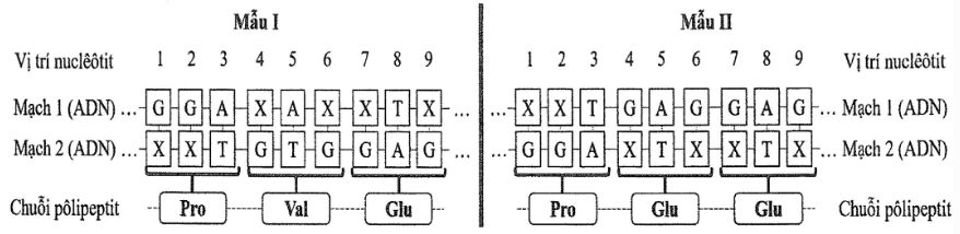 Ở người, xét một gen gồm hai alen: alen B mã hóa prôtêin M1, không gây bệnh M; alen b mã hóa prôtêin M2, gây bệnh M. Một loại kí sinh trùng gây ra bệnh N ở người không bị bệnh M, còn người bị bệnh M thường không mắc bệnh N. Để tìm hiểu cấu trúc của gen và prôtêin gây bệnh M, người ta phân tích trình tự nuclêôtit (ADN) và trình tự axit amin tương ứng của gen này ở người bình thường (BB) và người bị bệnh (bb). Kết quả chỉ thể hiện một phần trình tự nuclêôtit và chuỗi pôlipeptit do trình tự này mã hóa của hai người này kí hiệu là mẫu Ⅰ và mẫu II được thể hiện ở hình dưới đây.