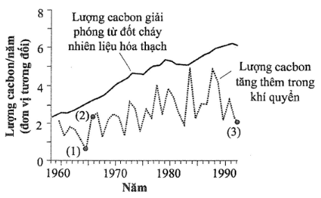 Hình bên mô tả sự thay đối lượng cacbon giải phóng từ đốt cháy nhiên liệu hóa thạch và lượng cacbon tăng thêm hằng năm trong khí quyên của Trái Đất qua các năm kể từ năm 1958 đến năm 1992. Có bao nhiêu nhận định sau đây về vấn đề này là đúng?