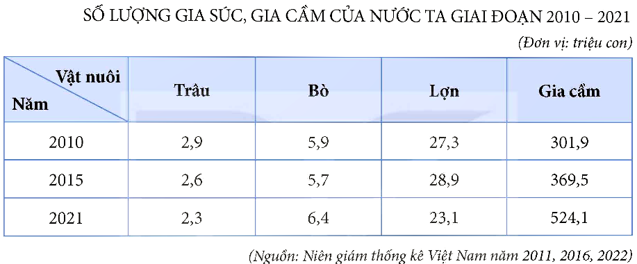 Dựa vào bảng số liệu trên, cho biết tốc độ tăng trưởng số lượng gia cầm nước ta năm 2021 là bao nhiêu %? (Làm tròn kết quả đến hàng đơn vị)