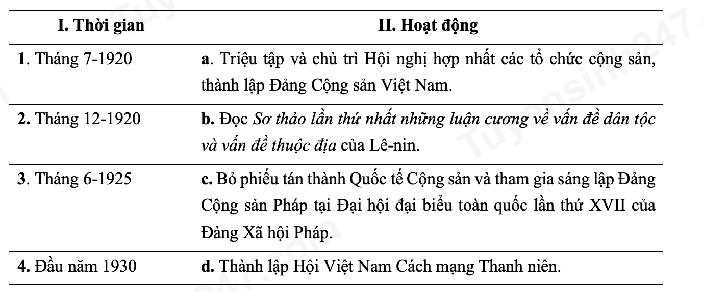 Phương án nào sau đây phản ánh đúng thời gian và hoạt động của Nguyễn Ái Quốc trong những năm 1920 - 1930?