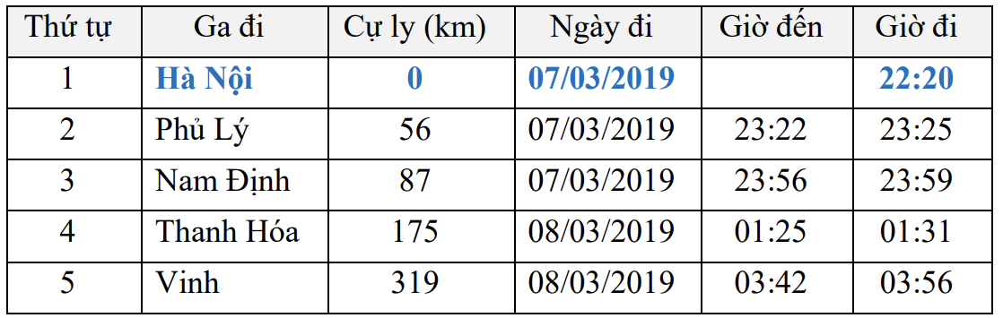 Bảng dưới đây mô tả một phần các ga trong hành trình và bảng giờ tàu Thống Nhất (SE1) chạy tuyến Hà Nội đi TP Hồ Chí Minh.