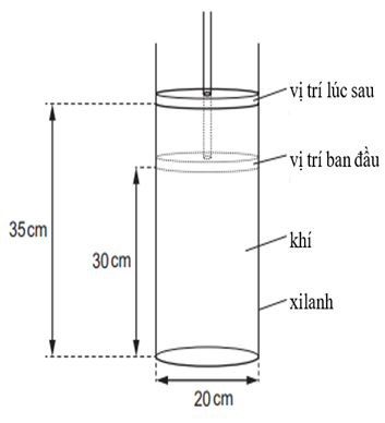 Một khối khí lý tưởng được chứa trong xilanh với pit-tông có thể chuyển động lên xuống theo phương thẳng đứng. Đường kính xilanh là 20 cm, áp suất khí là 102 kPa và ban đầu pit-tông cách đáy xilanh 30 cm như hình vẽ. Sau đó, khối khí được đốt nóng và đẩy pit-tông lên độ cao 35 cm so với đáy.