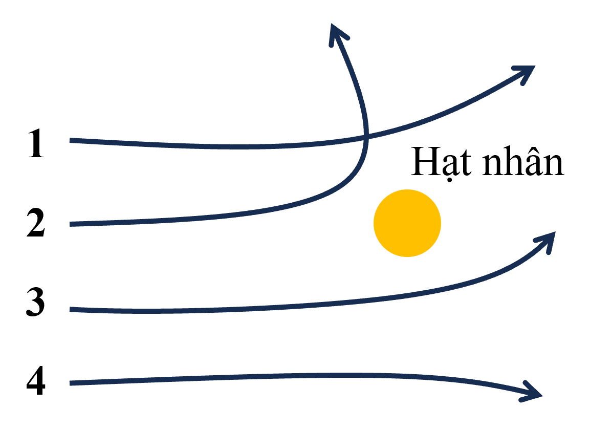 Trong thí nghiệm tán xạ alpha của Rutherford, chùm hạt alpha được bắn về phía hạt nhân của nguyên tử vàng.
