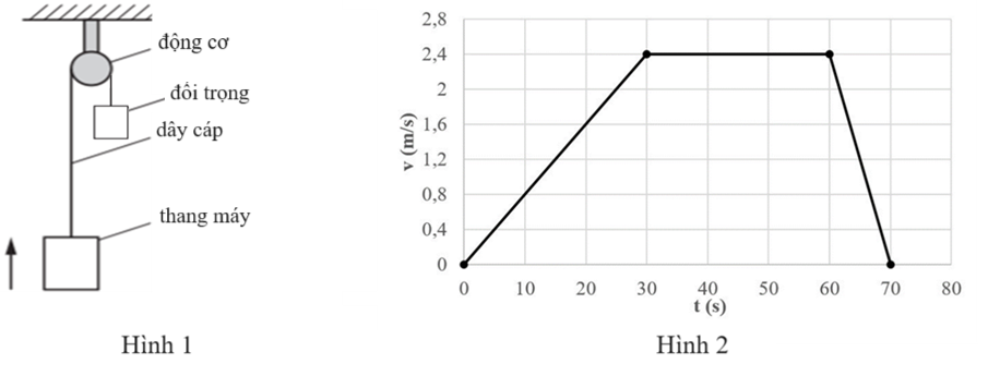 Một thang máy có khối lượng 1300 kg được kéo lên theo phương thẳng đứng bằng dây cáp nối với một động cơ như hình 1. Hình 2 là đồ thị biểu diễn sự biến thiên tốc độ v (m/s) của thang máy theo thời gian t (s) (lấy \({\rm{g}} = 9,8{\rm{ m/}}{{\rm{s}}^2}\)).