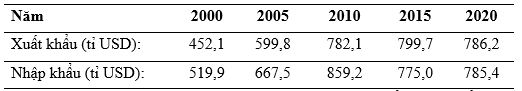 Dựa vào bảng số liệu, nhận xét nào sau đây đúng về tình hình xuất khẩu, nhập khẩu hàng hóa và dịch vụ của Nhật Bản giai đoạn 2000 - 2020?
