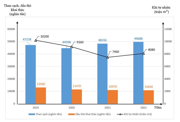 Biểu đồ dưới đây thể hiện nội dung nào về ngành công nghiệp khai thác than, dầu, khí của nước ta giai đoạn 2019 - 2022? (Niên giám thống kê Việt Nam 2023, Nxb Thống kê, 2024):