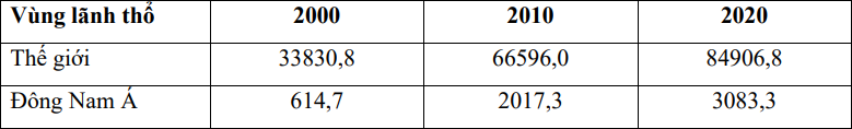 Với bảng số liệu sau, cho biết tỉ trọng GDP khu vực Đông Nam Á so với thế giới trong năm 2020 chiếm bao nhiêu %: