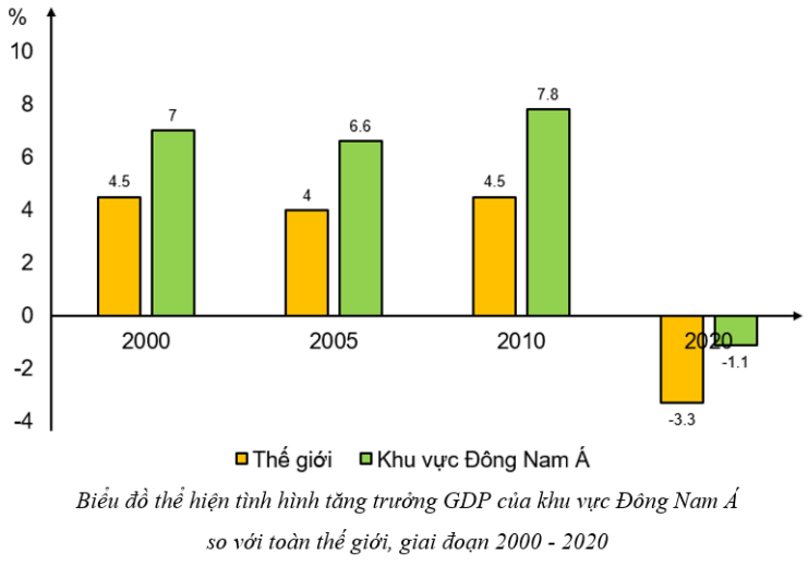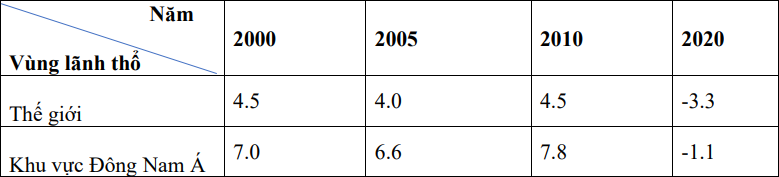 Cho bảng số liệu: TỐC ĐỘ TĂNG GDP TOÀN THẾ GIỚI VÀ KHU VỰC ĐÔNG NAM Á, GIAI ĐOẠN 2000 -