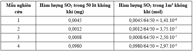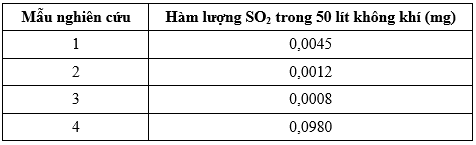 Khí SO2 do các nhà máy sinh ra là nguyên nhân quan trọng nhất gây ra mưa acid. Tiêu chuẩn quốc tế quy định nếu lượng SO2 vượt quá 30.10-6 mol/m3 không khí thì coi là không khí bị ô nhiễm. Người ta lấy 4 mẫu không khí ở các thành phố khác nhau và phân tích hàm lượng SO2 thì thu được kết quả như sau: