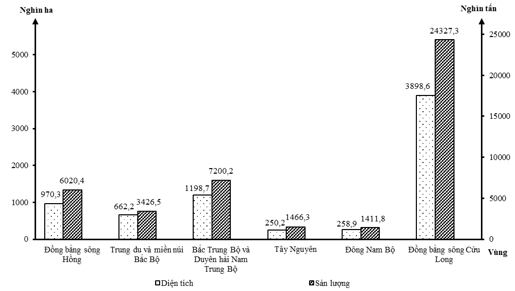 Biểu đồ dưới đây thể hiện nội dung nào về diện tích và sản lượng lúa của các vùng