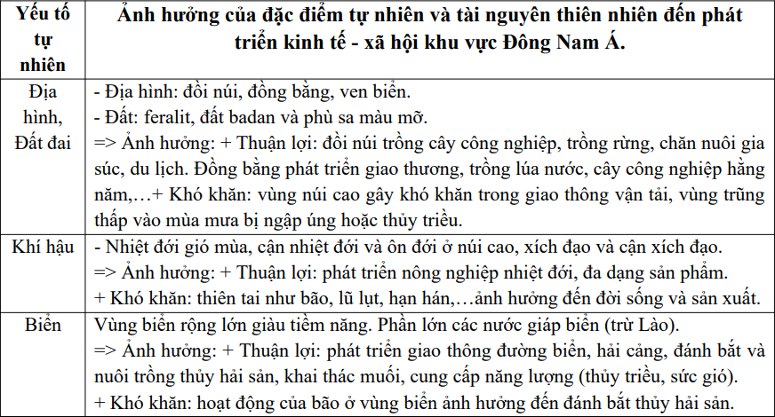 b) Phân tích ảnh hưởng của đặc điểm địa hình - đất đai, khí hậu và biển đến phát triển kinh tế - xã hội khu vực Đông Nam Á.