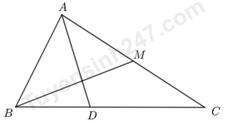 Tìm vectơ chỉ phương của đường phân giác trong xuất phát từ \(A\) vuông góc với đường trung tuyến xuất phát từ \(B\) của tam giác \(ABC.\)