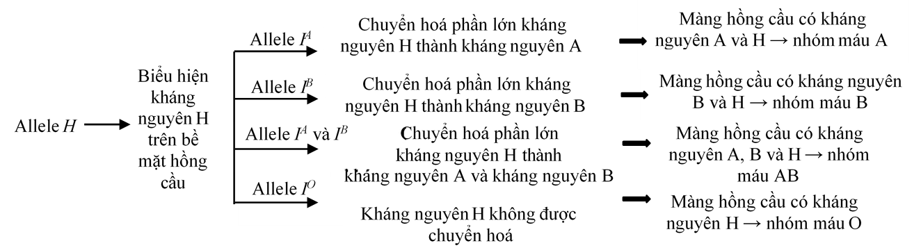 Ở người, gene ABO (gồm 3 allele IA, IB và IO, nằm trên nhiễm sắc thể số 9) và gene H (gồm 2 allele H và h, nằm trên nhiễm sắc thể số 19) cùng quy định nhóm máu. Sự hoạt động của các allele này được thể hiện theo sơ đồ sau: