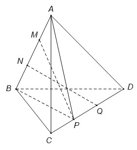 Cho tứ diện \(ABCD\). Gọi \(M,\,\,N\) là hai điểm phân biệt cùng thuộc đường thẳng \(AB\); \(P\,,\,\,Q\) là hai điểm phân biệt cùng thuộc đường thẳng \(CD\). Xác định vị trí tương đối của \(MQ\) và \(NP\).