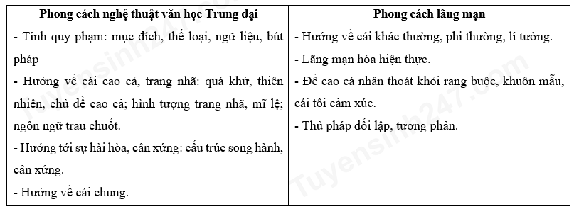 Chỉ ra điểm khác nhau giữa phong cách nghệ thuật của văn học trung đại và phong cách lãng mạn.