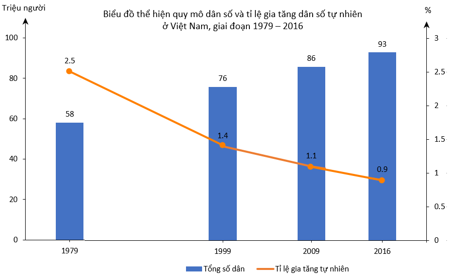 a) Vẽ biểu đồ thể hiện quy mô dân số và tỉ lệ gia tăng dân số tự nhiên ở Việt Nam, giai đoạn 1979 – 2016.
