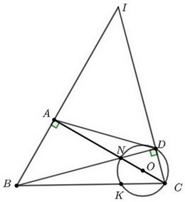3) Đường tròn đường kính NC cắt đoạn thẳng BC tại \(K(K\) khác \(C)\). Gọi \(I\) là giao điểm của hai đường thẳng BA và CD. Chứng minh ba điểm I, N, K thẳng hàng.