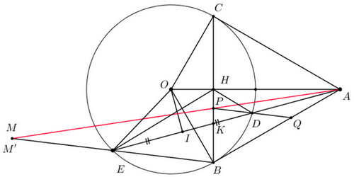 b) Gọi K là giao điểm của BC và AE. Chứng minh: \(AK.AI = AH.AO\).