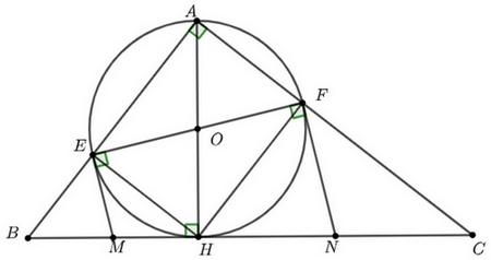 Cho tam giác ABC vuông tại \(A\), đường cao AH. Dựng đường tròn tâm \(O\) đường kính AH cắt AB tại \(E\), cắt AC tại \(F\). Các tiếp tuyến với đường tròn \((O)\) tại \(E\) và \(F\) lần lượt cắt cạnh BC tại \(M\) và \(N\).