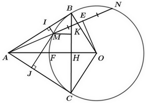 Cho đường tròn (O) và một điểm A cố định nằm ngoài đường tròn. Kẻ các tiếp tuyến AB, AC với (O) (B, C là các tiếp điểm). Gọi M là một điểm di động trên cung nhỏ BC (M khác B và C). Đường thẳng AM cắt (O) tại điểm thứ hai là N. Gọi E là trung điểm của đoạn thẳng MN.