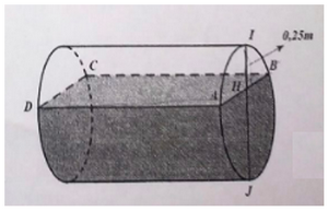 Một cái bồn hình trụ chứa đầy nước, có thể tích bằng 1500 lít, có đường kính đáy bằng 1m và được đặt nằm ngang như hình vẽ bên. Người ta rút một lượng nước trong bồn ra ngoài và đo được đoạn IH = 0,25m, IJ là đường kính đáy hình trụ và IJ vuông góc với AB tại H (ABCD là mặt thoáng phần nước còn lại). Hỏi diện tích mặt thoáng ABCD bằng bao nhiêu m2 (kết quả làm tròn đến hàng phần trăm, lấy \(\pi = 3,14\))